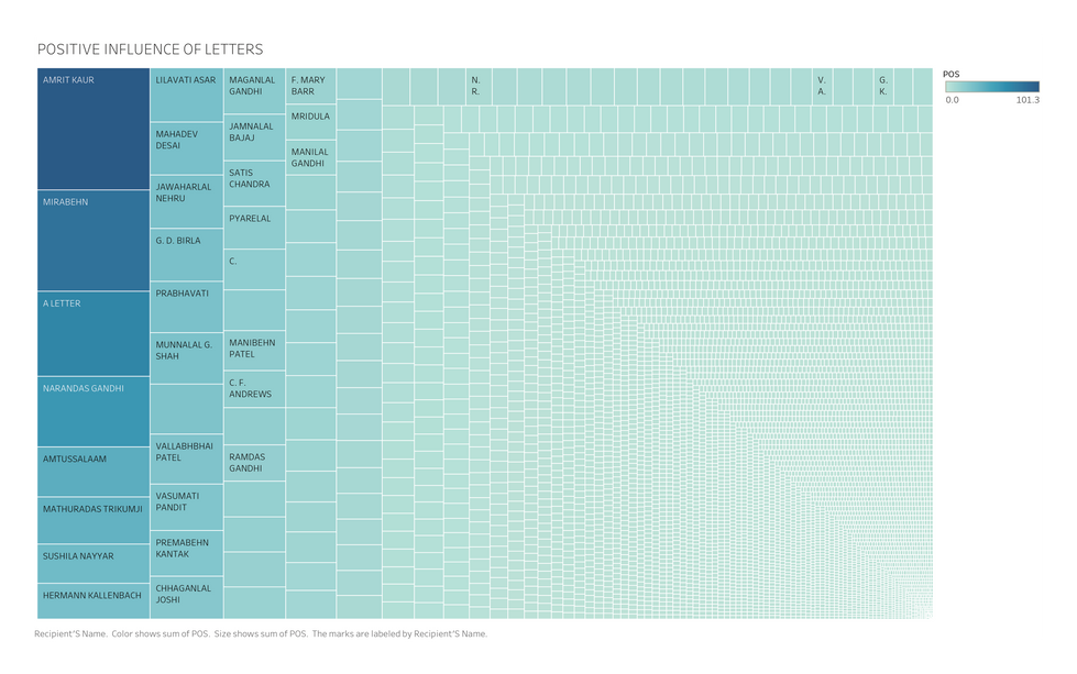 This project involves the comprehensive data analysis and visualization of Mahatma Gandhi's letters written during his entire lifetime including the freedom struggle. The project encompasses the collection of all his letters in digital format, using Machine Learning on Anaconda (Python language), parsing, cleaning, and filtering, followed by classification based on timelines, and frequency, later plotted as interactive visualizations using Tableau.